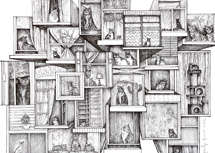 Window cats of PSC, pen & ink, 2022