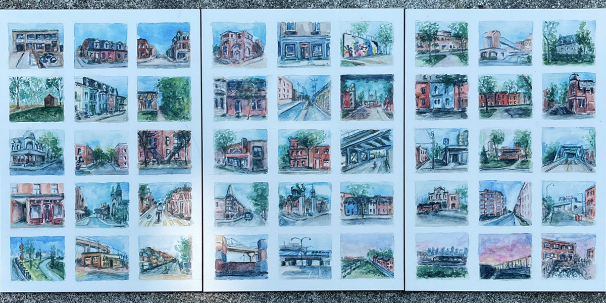 This series of 45 tiny watercolor paintings takes you on a walk starting at Bâtiment 7, winding through the neighborhood, and ending back at Bâtiment 7 at sunset. The project began as a way to document my neighborhood through a narrative visual story and gradually revealed the color palette of Pointe-Saint-Charles as it naturally emerged over the course of the paintings. The series also captures the neighborhood in this exact moment, as many of these spaces changed in the days and weeks that followed.