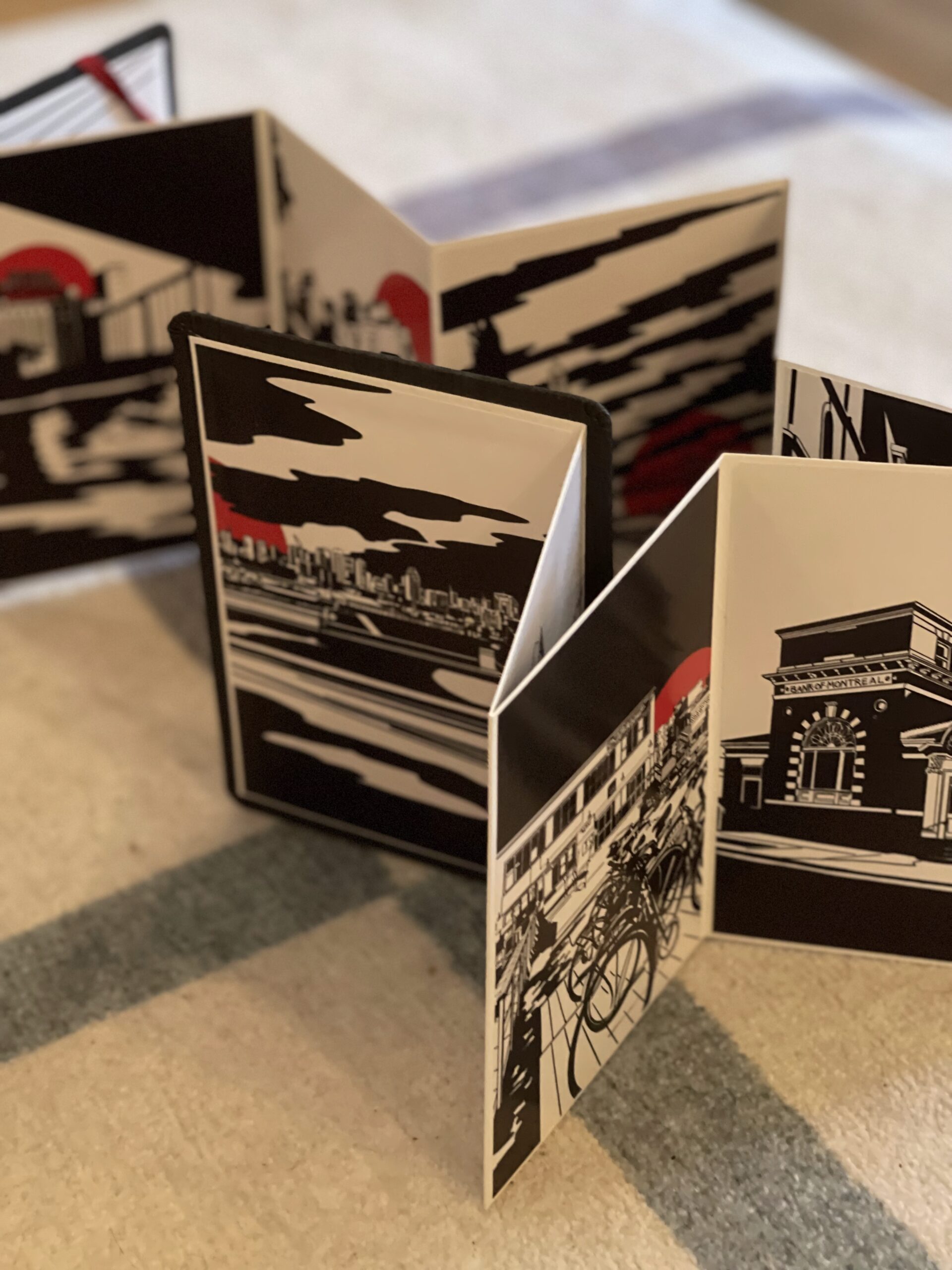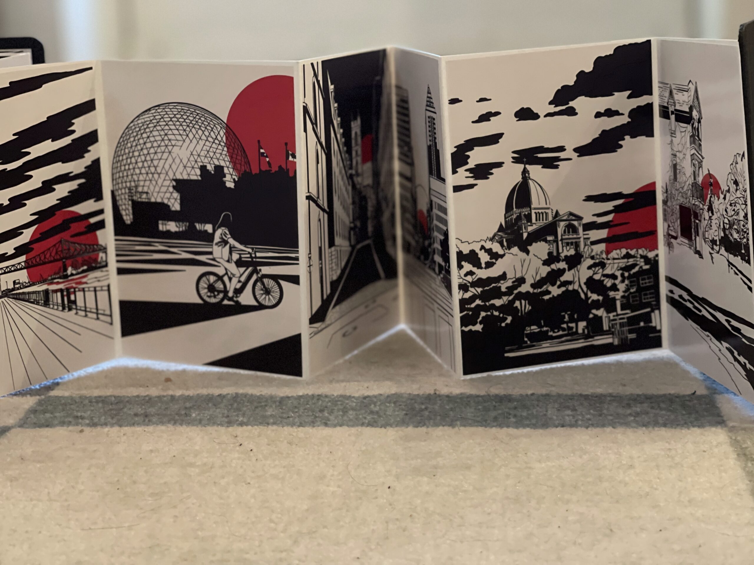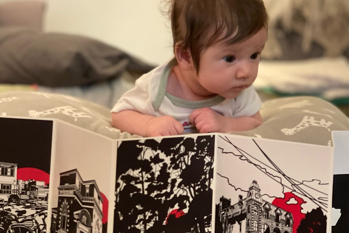 As a gift to my daughter, I set out to create one of these books for her. I wanted it to depict a journey through the neighborhood and the city we live in, showing her these scenes long before she would see them clearly with her own eyes, knowing that one day we will walk those streets together and that she might recognize them as home. When I discovered that red is one of the first colors babies begin to perceive, I chose to include a red sun in each image, inspired by her name, Soleil.