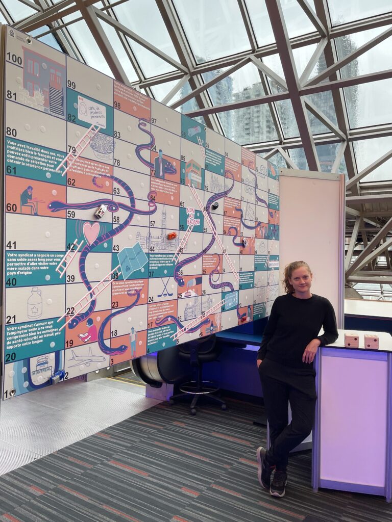 A large-scale Snakes and Ladders game designed and illustrated for the Confédération des syndicats nationaux’s convention. Participants rolled a large die, and a small car attached to the board with Velcro carried them through the ups and downs of the process toward permanent residency.